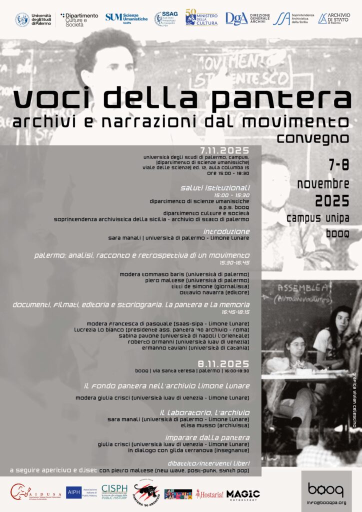 Il 7 e 8 novembre 2025 si terrà a Palermo il convegno Voci della Pantera. Archivi e narrazioni dal movimento, dedicato alla ricostruzione della nascita e dello sviluppo del movimento universitario del 1989/90. Il convegno è a cura del gruppo di ricerca Limone Lunare (Francesca Di Pasquale e Michela Nalbone, Soprintendenza archivistica della Sicilia – Archivio di Stato di Palermo; Giulia Crisci, IUAV – Università di Venezia; Sara Manali, Università di Palermo).